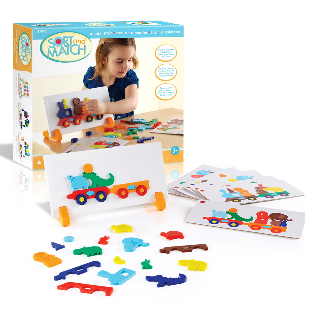 • Animal Train include: 6 carduri cu modele fata-verso, 46 de piese dintre care unele magnetice(in forma de animale, vagoane si locomotiva), o placa de joc metalica pe care se prind piesele magnetice si doua picioruse cu suporturi pentru sustinerea tablitei.