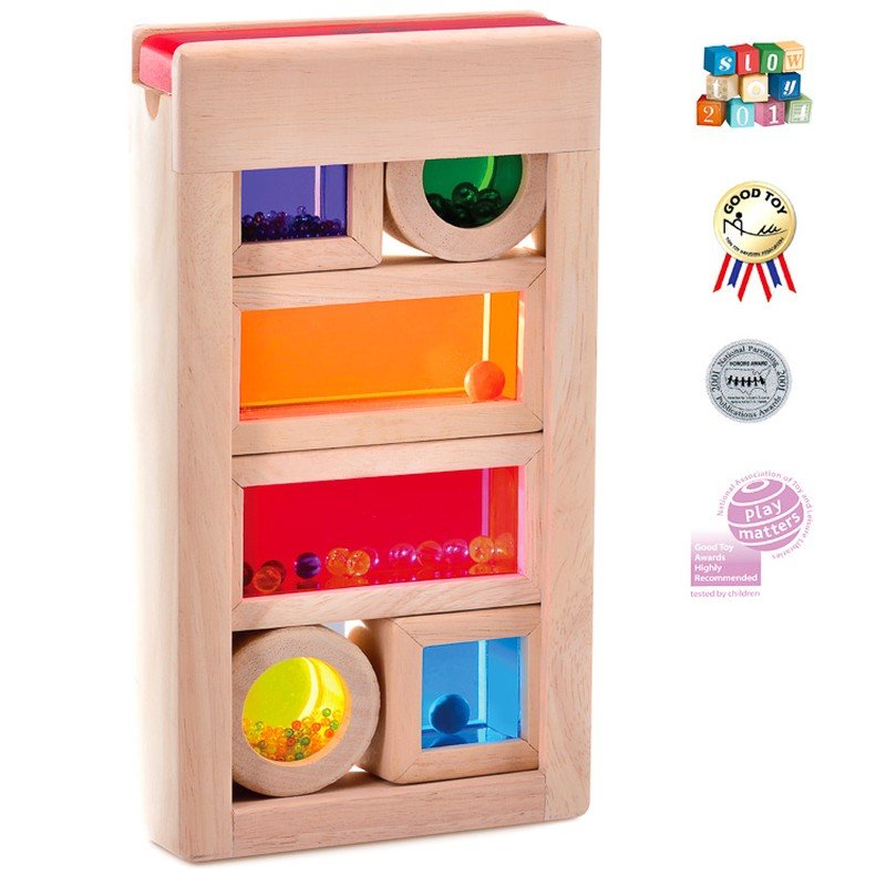 • Jucaria contine o cutie cadru cu capac si 6 blocuri cu sticla colorata, incadrata de margini din lemn: 2 dreptunghiuri, 2 patrate si 2 cilindri.
