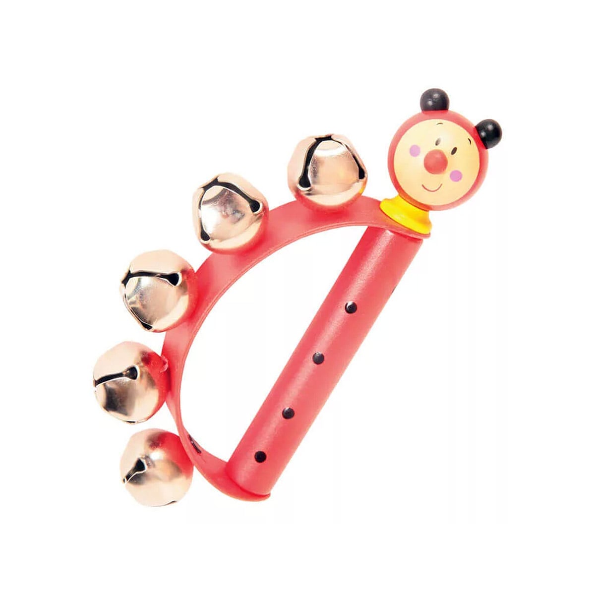 • De acest maner este prinsa o banda rigida din plastic, in forma de semicerc, pe care sunt atasati 5 clopotei metalici, care atunci cand sunt scuturati scot simultan sunete, spre incantarea celor mici.
