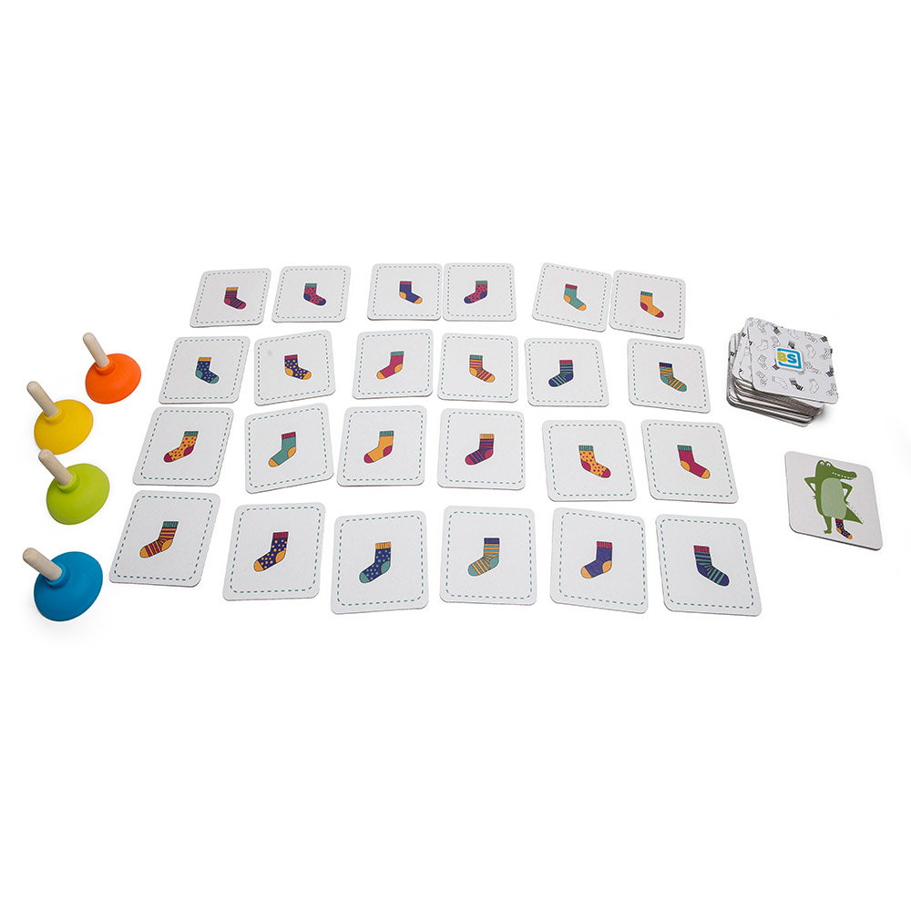 • Jocul consta din 24 de carduri din carton gros cu sosete colorate, 24 de carduri din carton gros cu crocodilul cu o singura soseta si 4 ventuze.