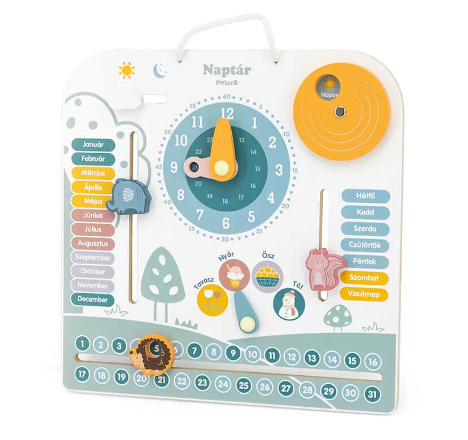 Ez a minőségi fa oktatási eszköz szórakoztató és szemléletes módon segít megismerkedni az évszakokkal, hónapokkal, napokkal, napszakokkal, időjárással és az órával.