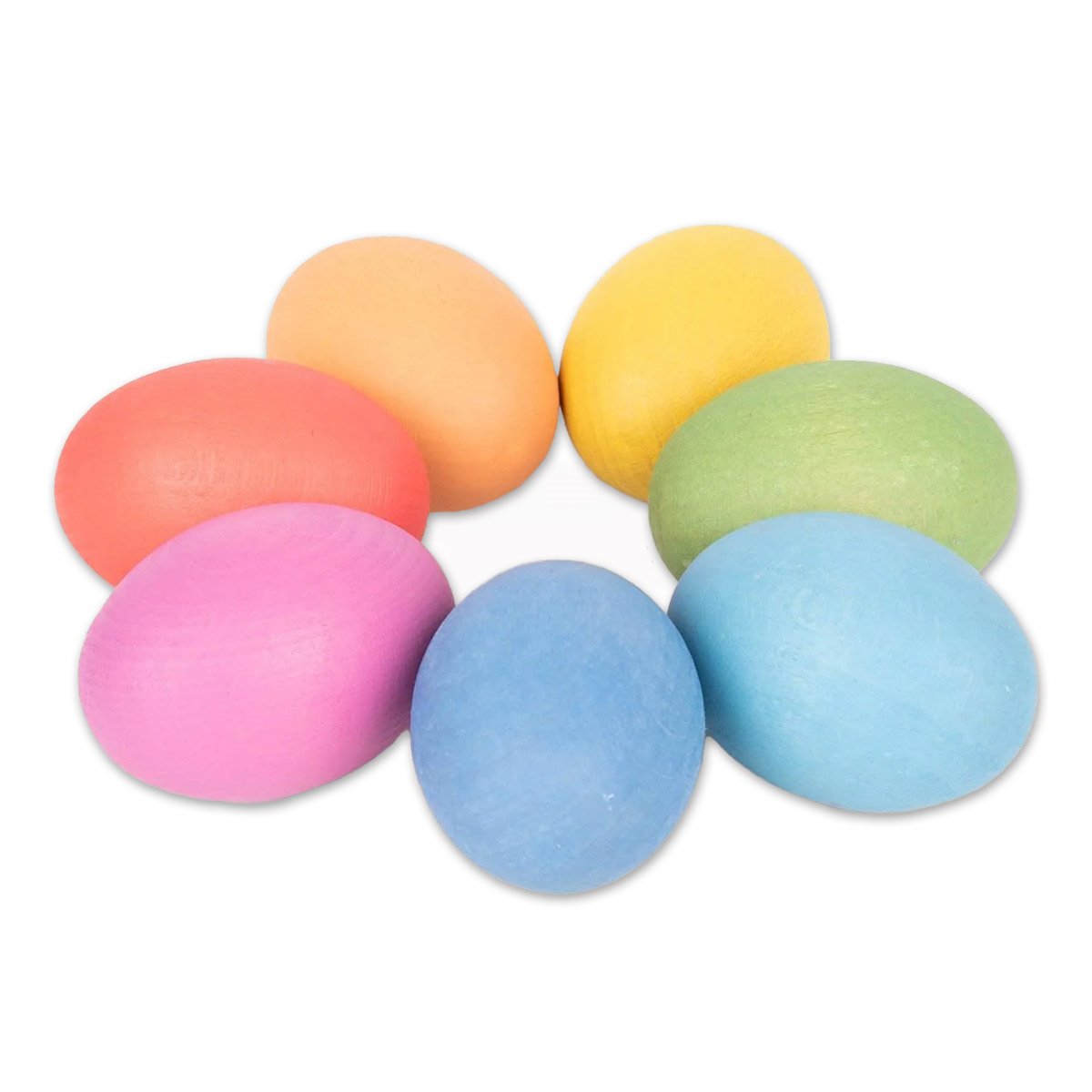 • Setul include 7 oua din lemn masiv de fag in cele sapte culori ale curcubeului.
