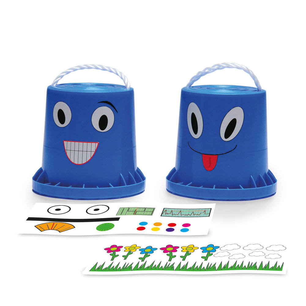 • Setul contine doua picioroange de plastic cu diametru de 10 cm si inaltimea de 12 cm si trei coli cu autocolante.