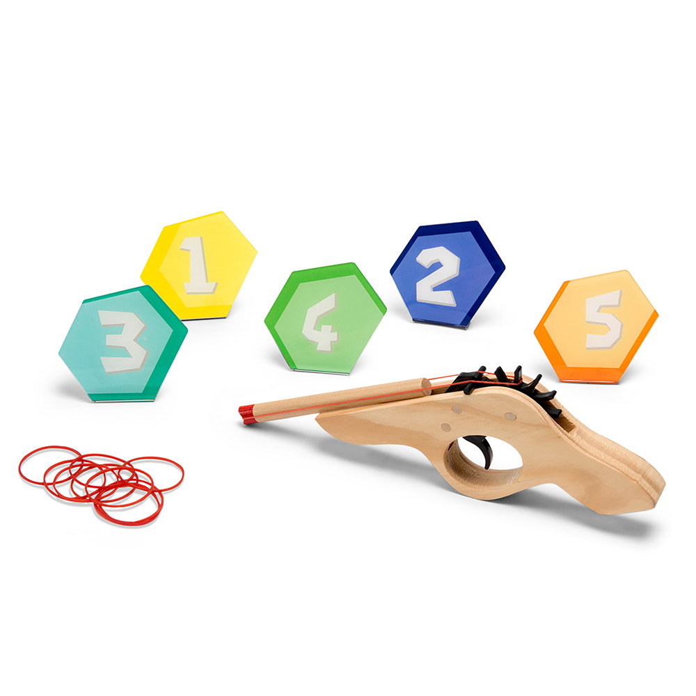 • Un joc amuzant pentru intreaga familie, in care jucatorii trebuie sa isi arate indemanarea si precizia, tragand cu elastice in tinte, cu ajutorul pistolului din lemn.