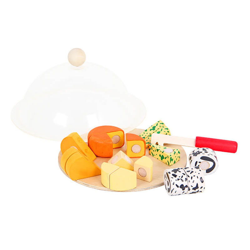 • Setul de joaca din lemn este exigent lucrat si finisat, cu piese care imita diferite tipuri de cascaval si branza, pe care micutii le pot folosi pentru a le combina cu alte seturi de alimente, pentru a le servi familiei, prietenilor sau papusilor preferate.