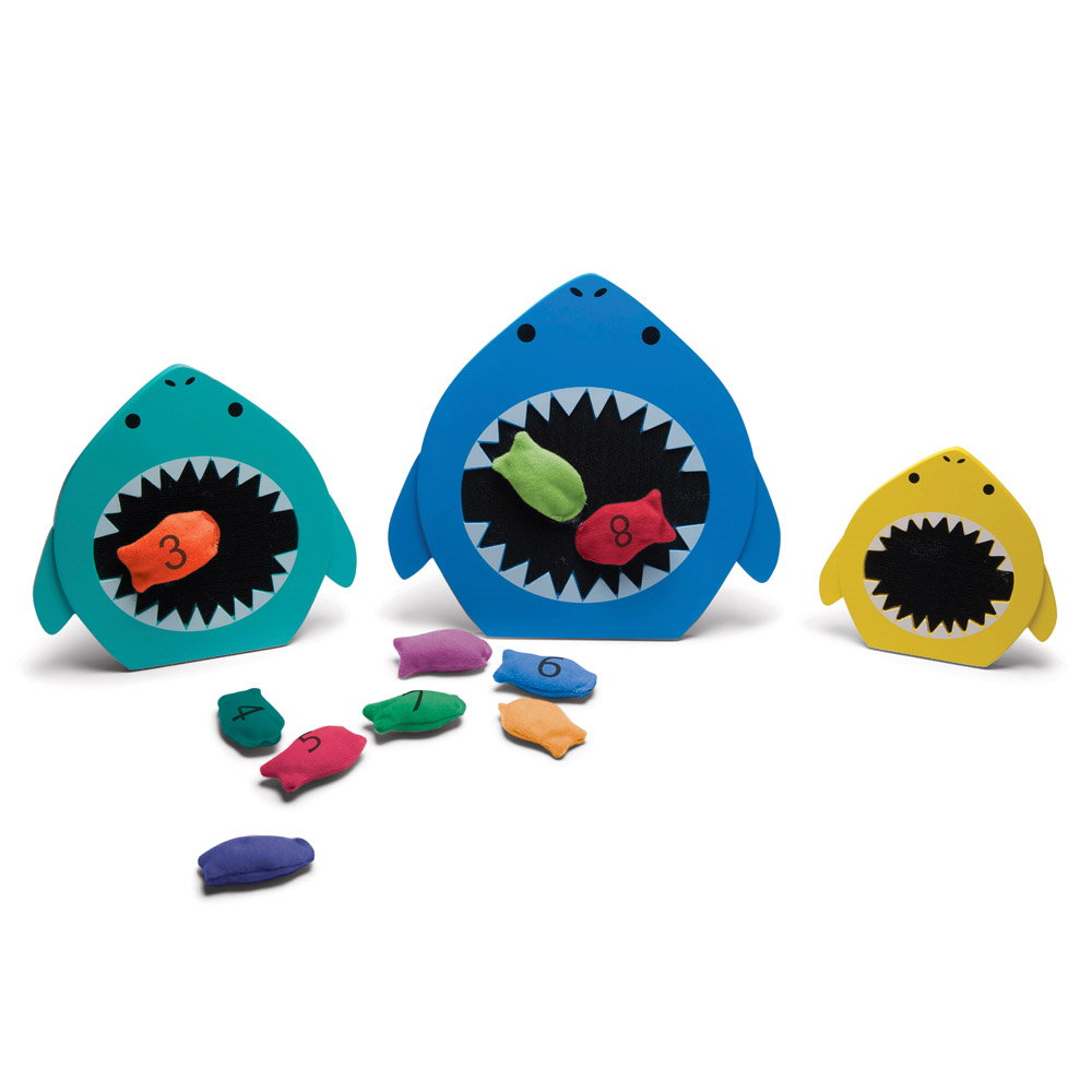 • A doua varianta a jocului este ideala pentru a preda copiilor matematica in timp ce se distreaza. Scopul este de a hrani fiecare rechin cu exact 10 puncte. De ex.: arunca pestele cu nr. 4 si cu nr. 6 in gura unuia dintre rechini. Pentru aceasta, copilul va trebui, prin urmare, sa calculeze si sa sorteze cu atentie pestisorii.